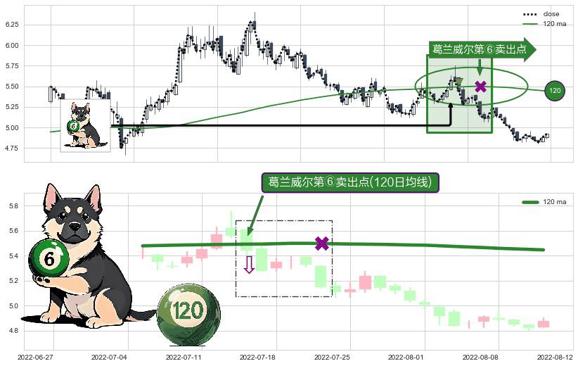 形态多维评估: ⚀ 2022-07-14-日显现 葛兰威尔均线 120日均线 第⑥卖出点 走势反转见顶信号,后市看跌,卖出信号