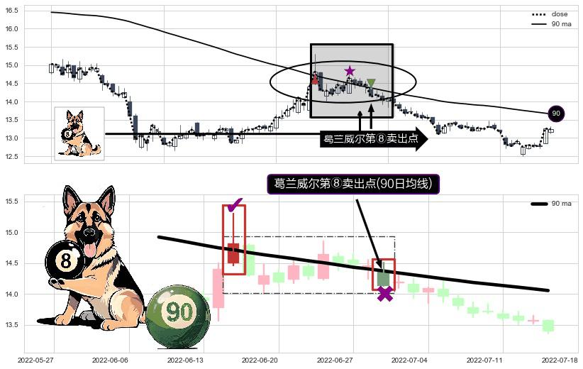 形态多维评估: ⚀ 2022-06-29-日显现 葛兰威尔均线 90日均线 第⑧卖出点 下降趋势的中继信号,后市看跌,卖出信号