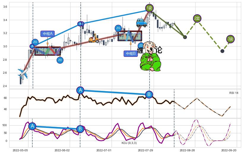 ➢ 【中枢A】:2022-05-10-2022-05-26,中枢由5笔构成,共13交易日, ZG=2.970, ZD=2.880
