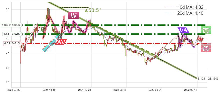 ♘ 支撑价格位4.32,可信任强度60.95%,距离最后交易2022-08-12形成的收盘价格4.35相差 -0.61%