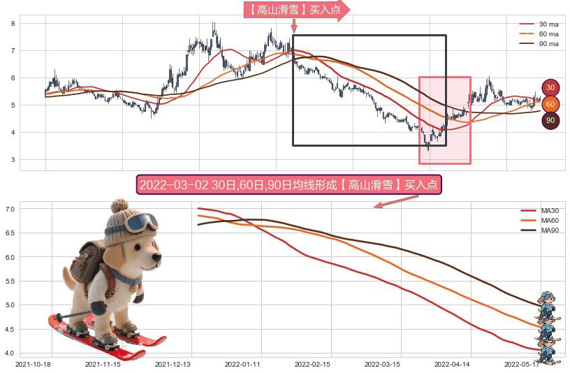 ⚀ 2021-12-15日-2022-05-17日显现 30日-60日-90日均线 【高山滑雪】买入点 看多信号,后市看涨,买入