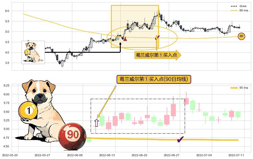 ⚀ 2022-06-08-日显现 葛兰威尔均线 90日均线 第买①入点 走势反转见底信号,后市看涨,买进信号