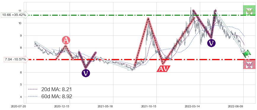 ♘ 支撑价格位7.04,可信任强度80.70%,距离最后交易2022-08-12形成的收盘价格7.87相差 -10.57%