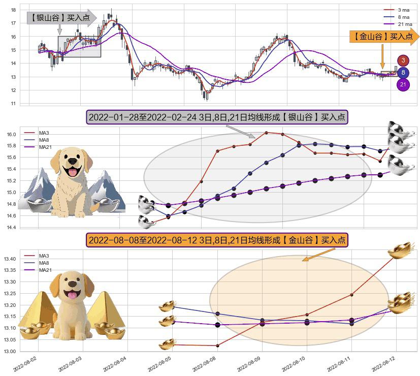 ⚄ 2022-08-09-日至2022-08-12-日显现 3日-8日-21日均线 【金山谷】买入点 其再次确认了买入信号,可靠性更强,买入