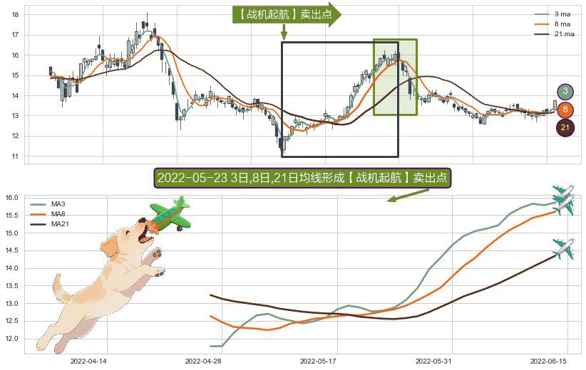 形态多维评估: ⚀ 2022-04-27日-2022-06-14日显现 3日-8日-21日均线 【战机起航】卖出点 看空信号,后市看跌,卖出