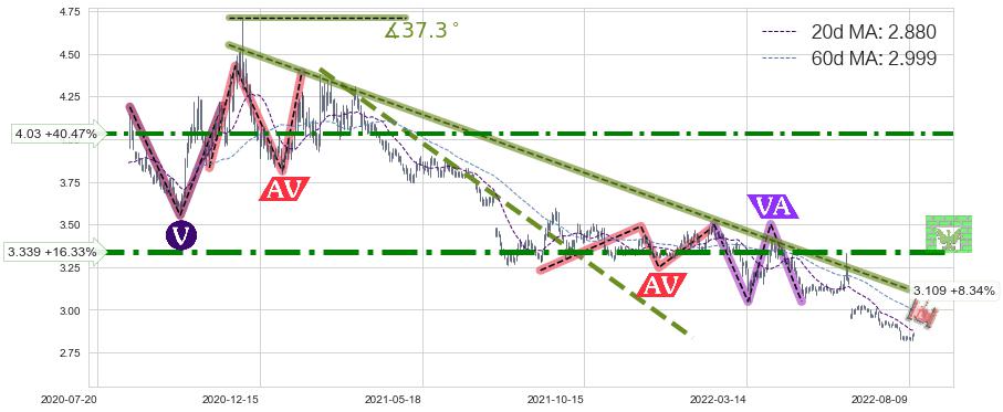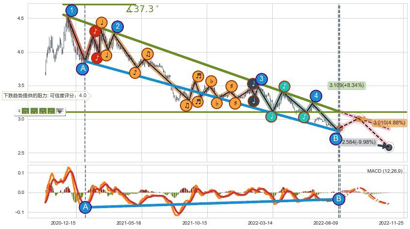 ♘ 在最后的下跌阶段2020-11-18至2022-08-12,存在 持续未破位的阻力位 ,阻力价格3.109,可信任强度83.87%,其距离最后价格2.870相差 +8.34%