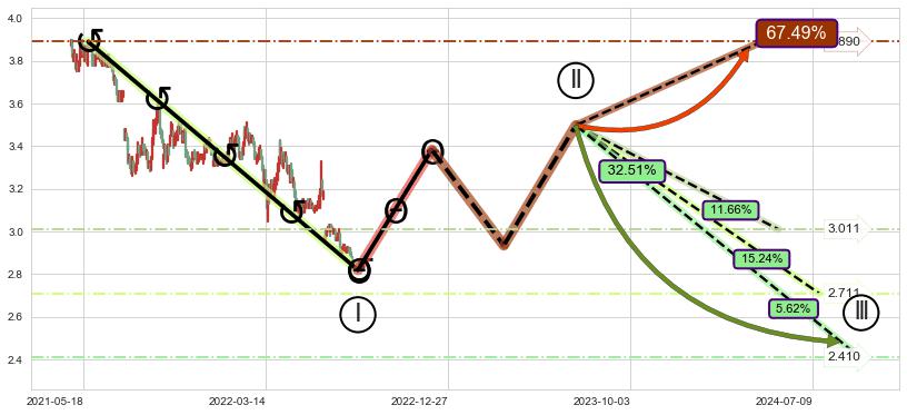 ➢ 循环浪继续向下【最高】位置(2024-05-16, 3.011),匹配聚类样本比例35.85%, 可能性概率11.66%