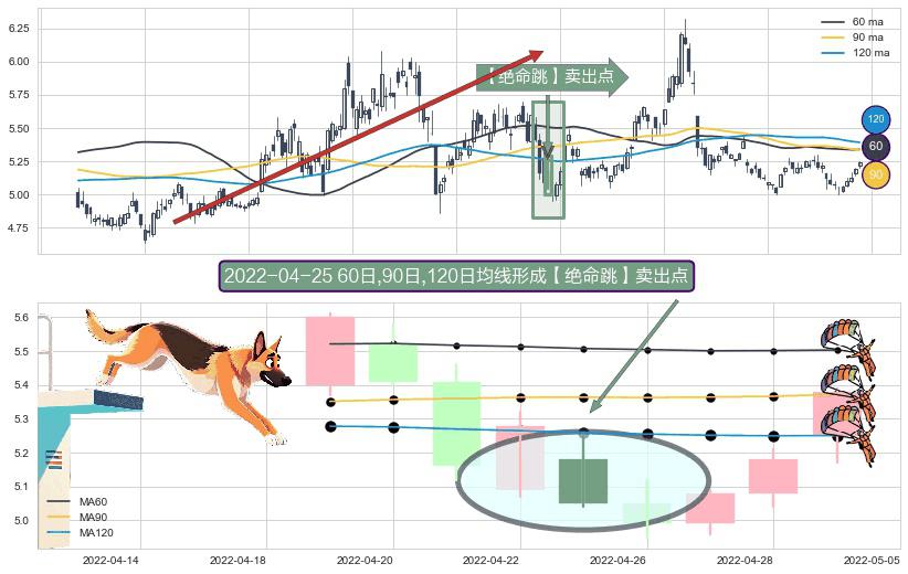 ⚀ 2022-04-25日显现 60日-90日-120日均线 【绝命跳】卖出点 看空信号,后市看跌,卖出