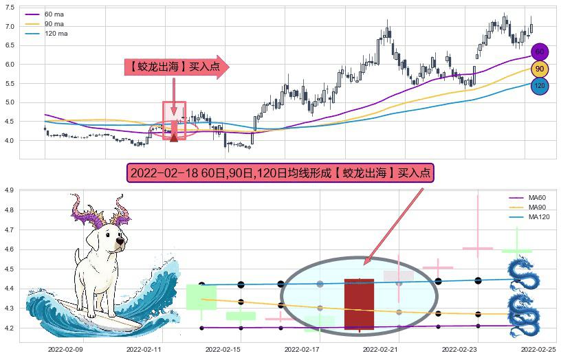 形态多维评估: ⚀ 2022-02-18日显现 60日-90日-120日均线 【蛟龙出海】买入点 看多信号,后市看涨,买入
