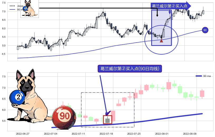 形态多维评估: ⚀ 2022-07-15-日显现 葛兰威尔均线 90日均线 第②买入点 上升趋势的中继信号,后市看涨,买进信号