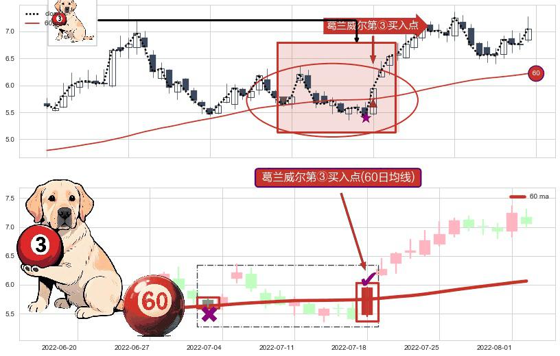 形态多维评估: ⚀ 2022-07-18-日显现 葛兰威尔均线 60日均线 第③买入点 上升趋势的中继信号,后市看涨,买进信号