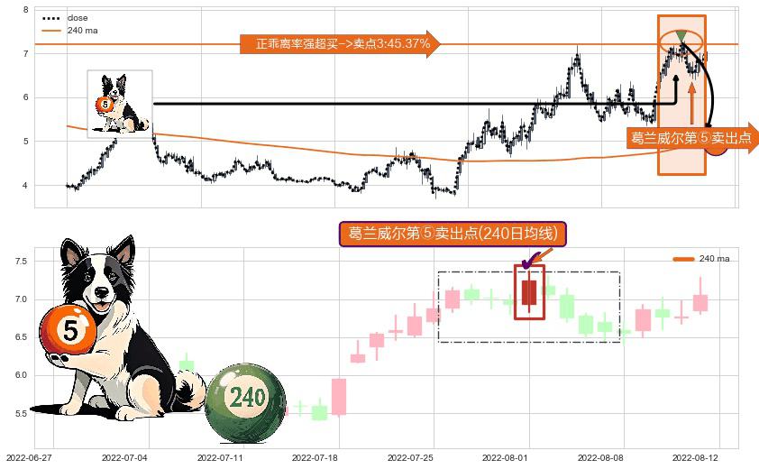 形态多维评估: ⚀ 2022-08-01-日显现 葛兰威尔均线 240日均线 第⑤卖出点 上升趋势均值回复的短线回落信号,后市看跌,卖出信号