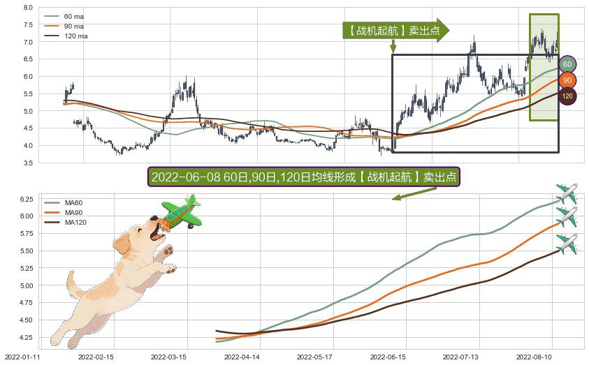 形态多维评估: ⚀ 2022-03-25日-2022-08-12日显现 60日-90日-120日均线 【战机起航】卖出点 看空信号,后市看跌,卖出