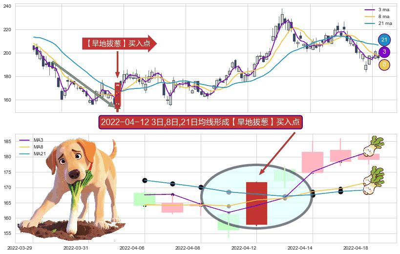 ⚀ 2022-04-12日显现 3日-8日-21日均线 【旱地拔葱】买入点 看多信号,后市看涨,买入