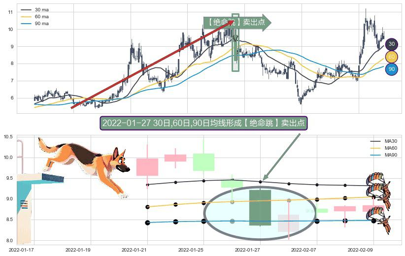 形态多维评估: ⚀ 2022-01-27日显现 30日-60日-90日均线 【绝命跳】卖出点 看空信号,后市看跌,卖出