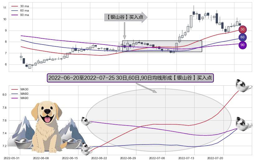 形态多维评估: ⚀ 2022-06-21-日至2022-07-25-日显现 30日-60日-90日均线 【银山谷】买入点 看多信号,后市看涨,买入
