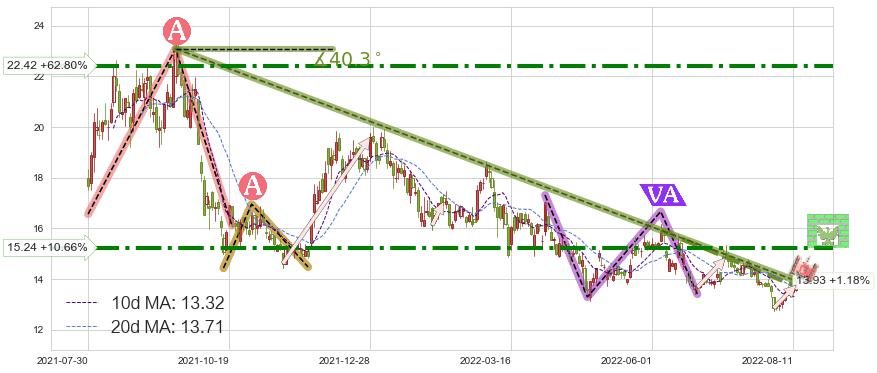 🦴 长线均值回复组合短线趋势跟踪[强阻力信号]2021-09-13-2022-08-11下跌趋势依然成立(下跌趋势跟踪依然存在),短线价格略微上行反弹(均值回复猜想),即将接近下跌趋势提供的未破位阻力价格:13.93。