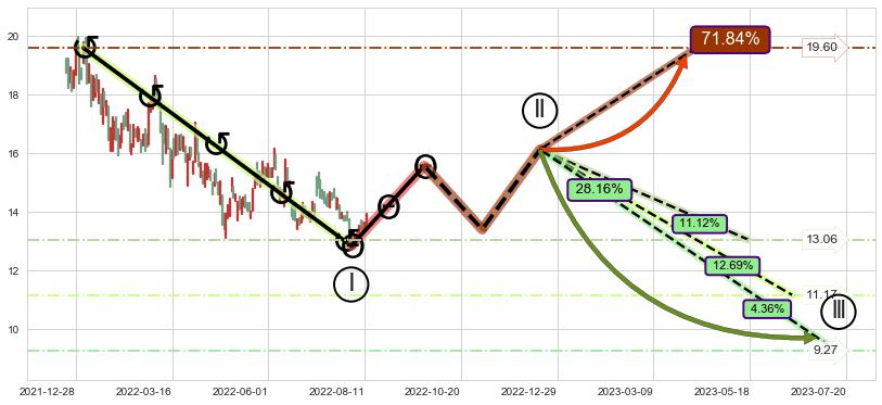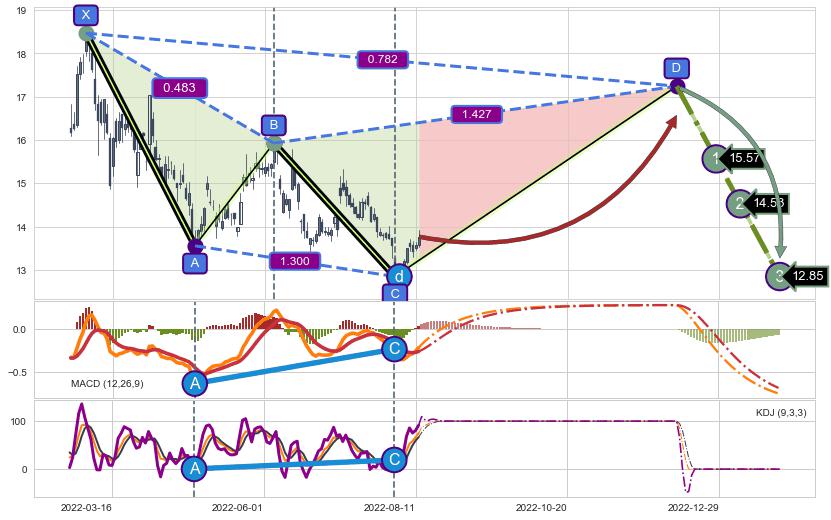 ➣ D点拟合预测价格17.24,距离最后交易收盘价格13.77相差 +25.23%
