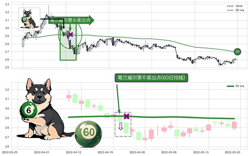 ⚀ 2022-04-20-日显现 葛兰威尔均线 60日均线 第⑥卖出点 走势反转见顶信号,后市看跌,卖出信号