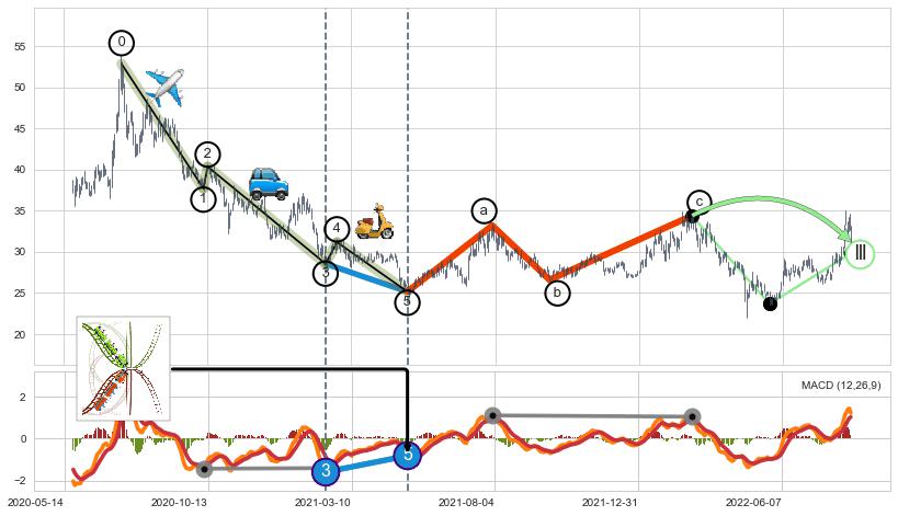 ➣ 第一, 三, 五浪下跌动能逐渐【衰弱变小】,趋势呈现不稳迹象