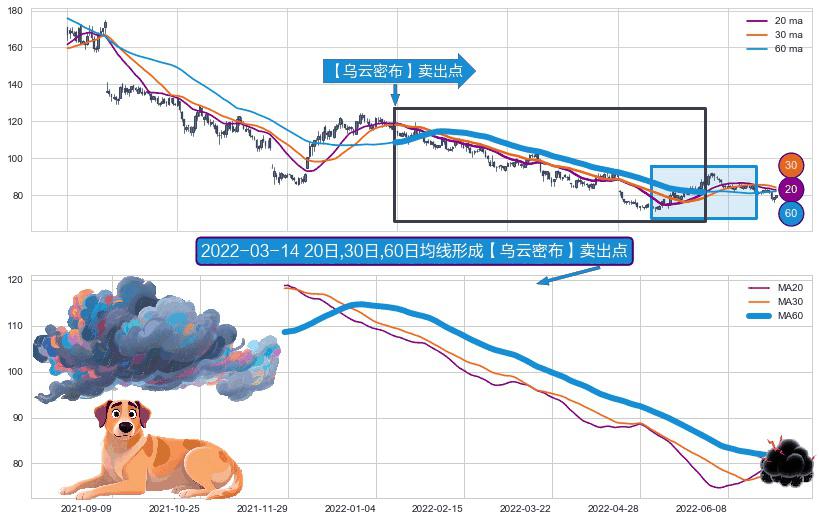 ⚃ 【乌云密布】卖出点长时间对 牛 市转 熊 市进行确认,且均线压制价格走势,但信号发出时间较长,属于【迟滞】看空卖出信号