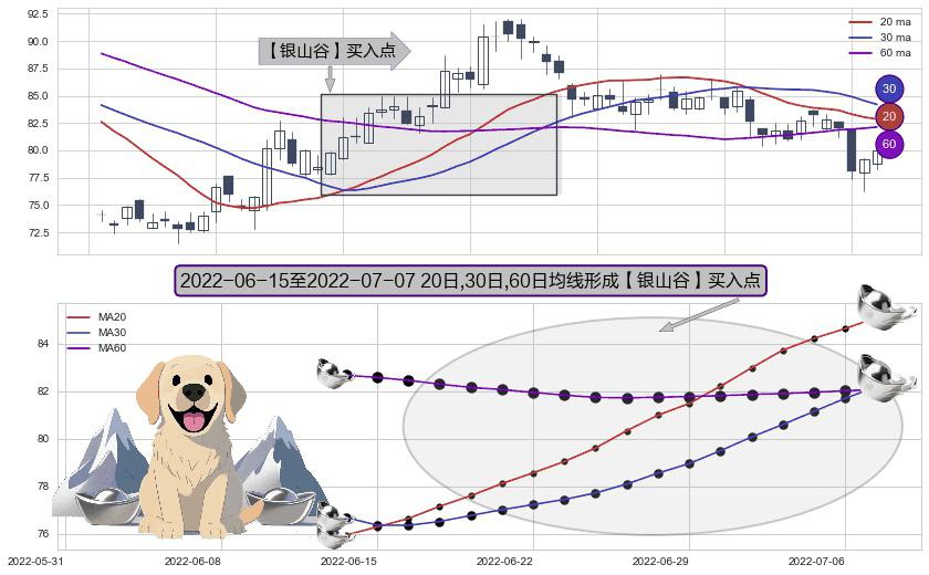 形态多维评估: ⚀ 2022-06-16-日至2022-07-07-日显现 20日-30日-60日均线 【银山谷】买入点 看多信号,后市看涨,买入