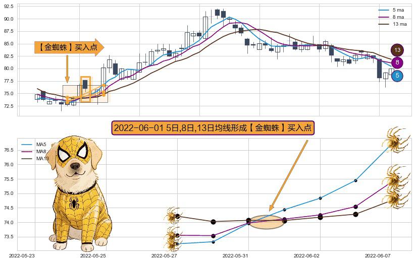 形态多维评估: ⚀ 2022-06-01日显现 5日-8日-13日均线 【金蜘蛛】买入点 看多信号,后市看涨,买入
