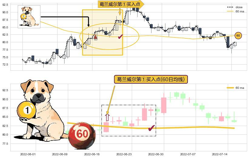 形态多维评估: ⚀ 2022-06-17-日显现 葛兰威尔均线 60日均线 第买①入点 走势反转见底信号,后市看涨,买进信号