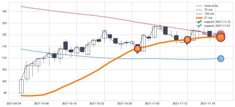 上涨趋势2021-09-24-2021-11-22,均线21确认关键支撑2处