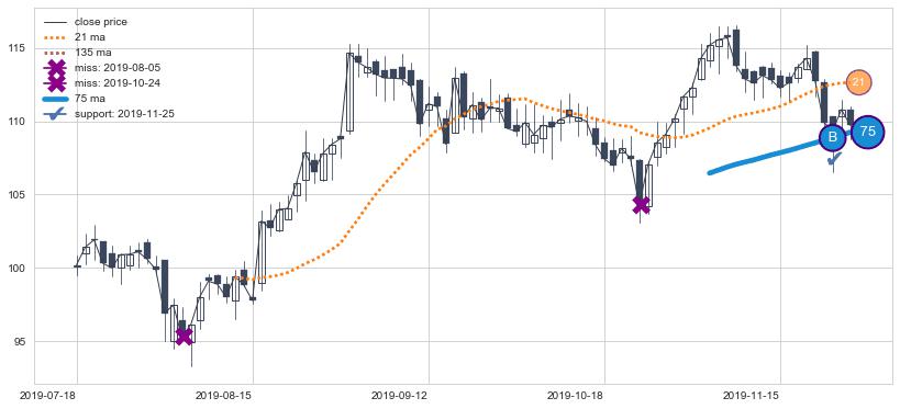 上涨趋势2019-07-18-2019-11-27,均线75确认关键支撑1处