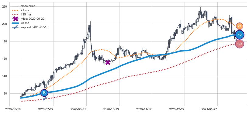 上涨趋势2020-06-18-2021-02-23,均线75确认关键支撑1处