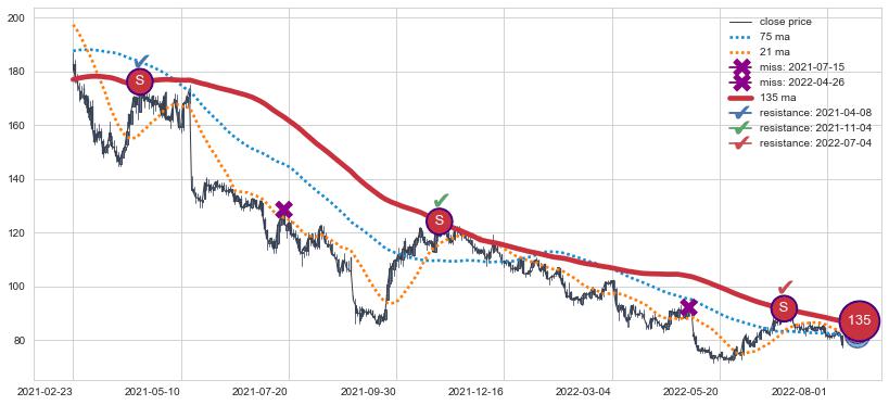 下跌趋势2021-02-23-2022-08-10,均线135确认关键阻力3处