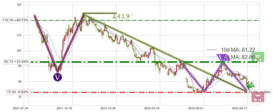 ♘ 阻力价格位92.72,可信任强度89.27%,距离最后交易2022-08-12形成的收盘价格79.98相差 +15.93%