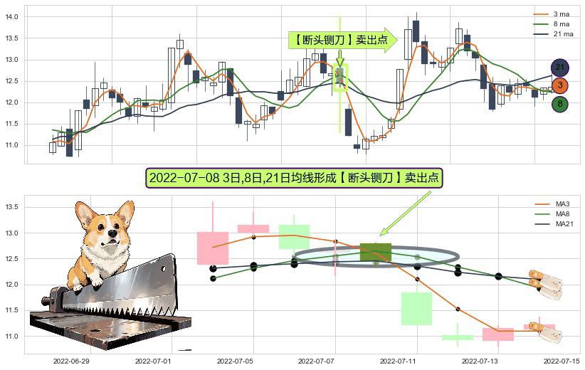 形态多维评估: ⚀ 2022-07-08日显现 3日-8日-21日均线 【断头铡刀】卖出点 看空信号,后市看跌,卖出