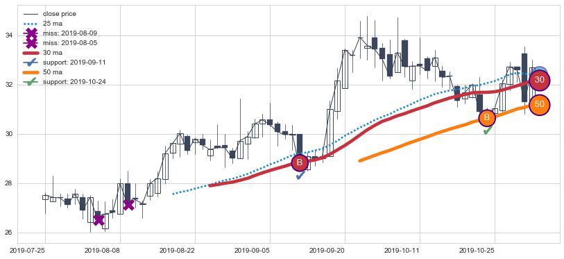 上涨趋势2019-07-25-2019-11-01,均线50, 30确认关键支撑2处