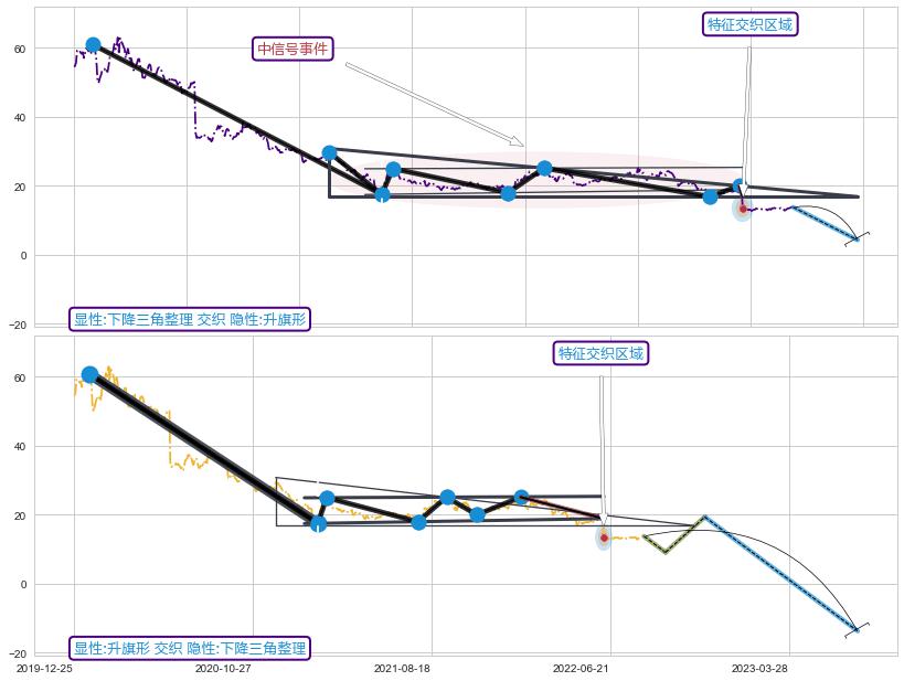 | 3 🅚:升势停顿 ➕ 📐:下降三角整理下行突破支撑位破位, 猜想持续下沉下跌,被突破的支撑位已变为阻力位 ☞ 看空信号 ⇥ 【🅚线】交织【图形】⇥ 综合量化分数: 49 | > |