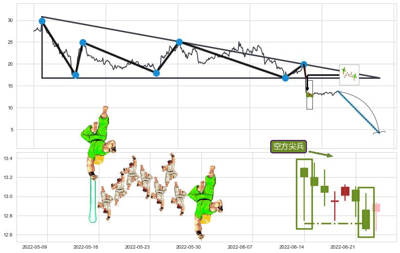 ➢ 【多方力量耗尽,空方打破攻守平衡点】下降三角形中继整理, 已在2022-06-10突破【支撑】颈线 16.81 →演变成下降通道