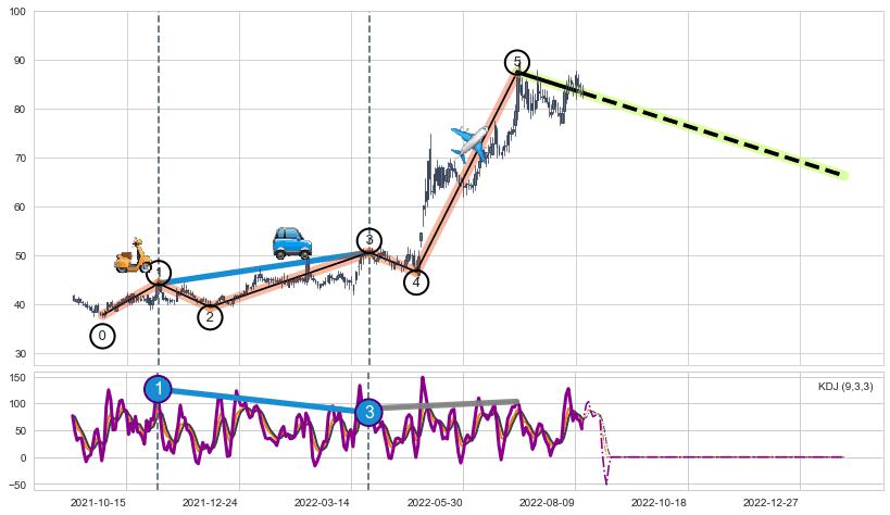 ➢ 第一, 三驱动浪端点:【KDJ】走势出现【常规背离 & 反转信号】背离程度99.00%,背离夹角角度39.8˚,背离程度较大