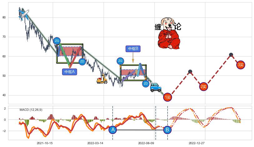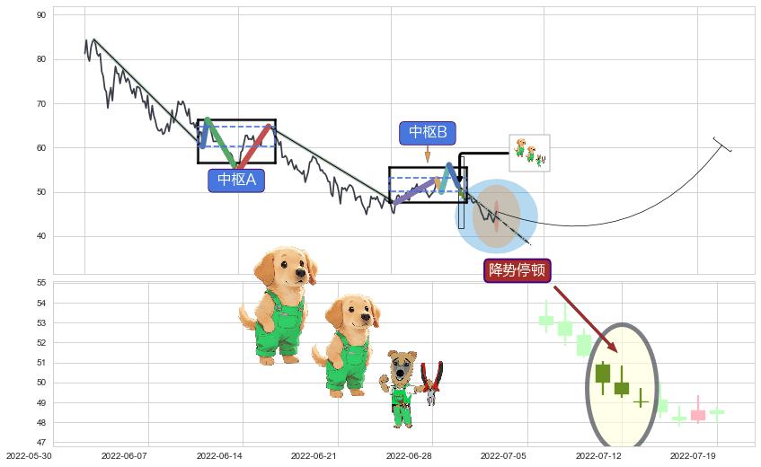 ➢ 【中枢B】:2022-05-11-2022-07-08,中枢由5笔构成,共42交易日, ZG=52.89, ZD=51.35