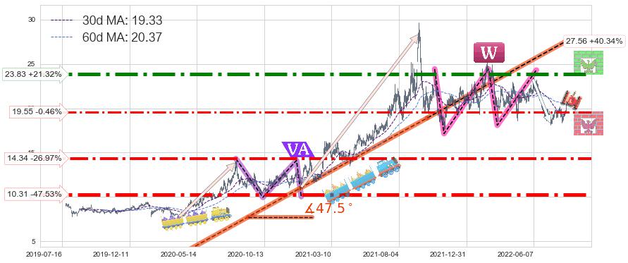 ♘ 支撑价格位19.55,可信任强度58.45%,距离最后交易2022-08-12形成的收盘价格19.64相差 -0.46%
