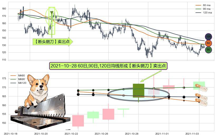 ⚀ 2021-10-28日显现 60日-90日-120日均线 【断头铡刀】卖出点 看空信号,后市看跌,卖出