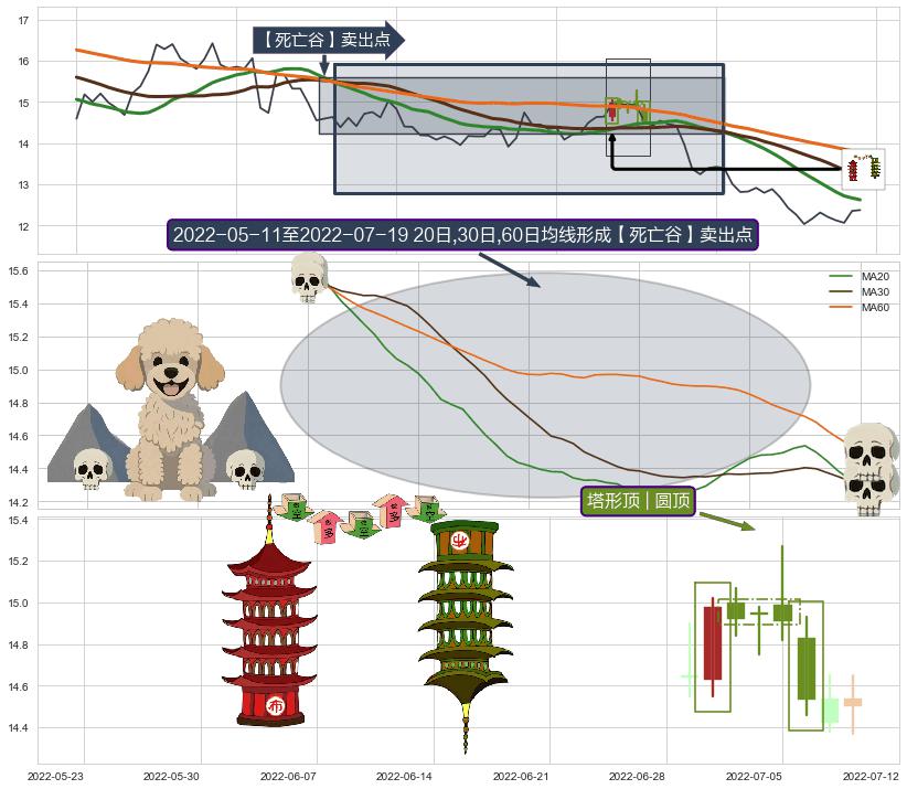 | 7 🅚:下跌两颗星 | 下跌三颗星 ➕ 🎢:【死亡谷】卖出点均线组合卖出点信号形成后,猜想后续破位下跌,沿着向下的尖头三角下跌 ☞ 看空信号 ⇥ 【均线】交织【🅚线】⇥ 综合量化分数: 33 | > |