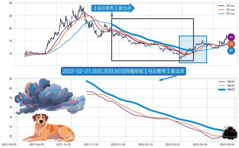 形态多维评估: ⚀ 2021-11-12日-2022-05-27日显现 20日-30日-60日均线 【乌云密布】卖出点 看空信号,后市看跌,卖出