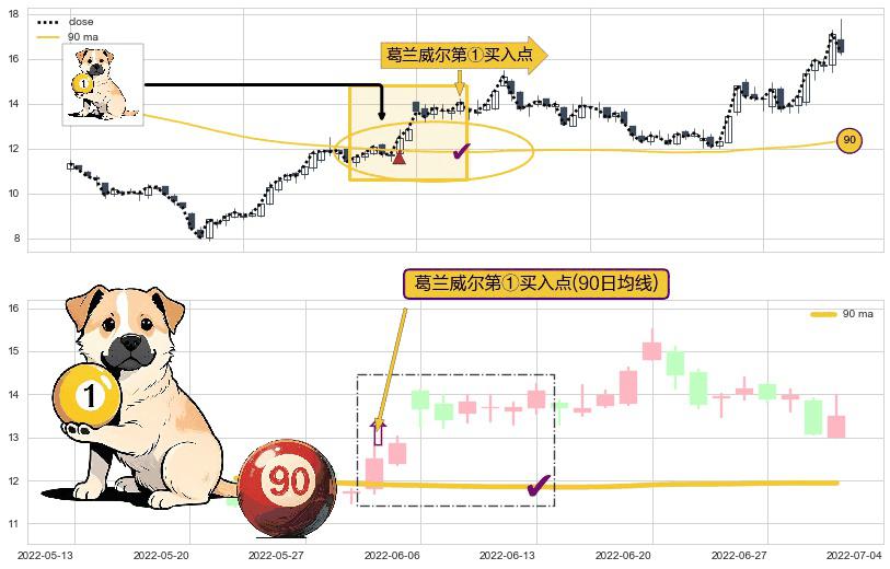 形态多维评估: ⚀ 2022-06-01-日显现 葛兰威尔均线 90日均线 第买①入点 走势反转见底信号,后市看涨,买进信号