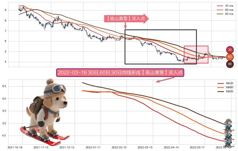 ⚀ 2021-12-21日-2022-06-09日显现 30日-60日-90日均线 【高山滑雪】买入点 看多信号,后市看涨,买入