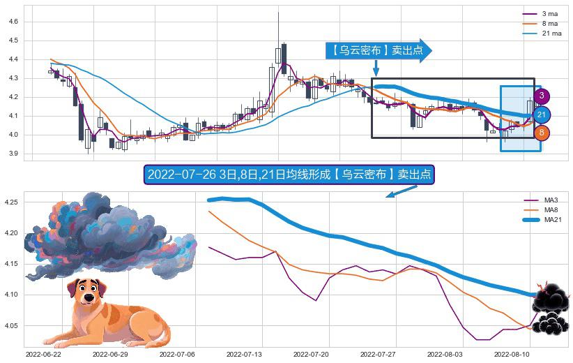 ⚀ 2022-07-07日-2022-08-11日显现 3日-8日-21日均线 【乌云密布】卖出点 看空信号,后市看跌,卖出