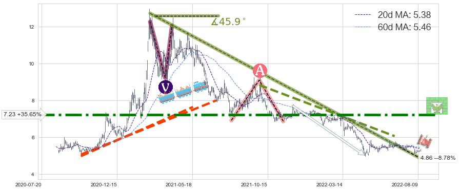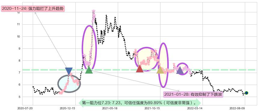 ♘ 阻力价格位7.23,可信任强度89.89%,距离最后交易2022-08-12形成的收盘价格5.33相差 +35.65%