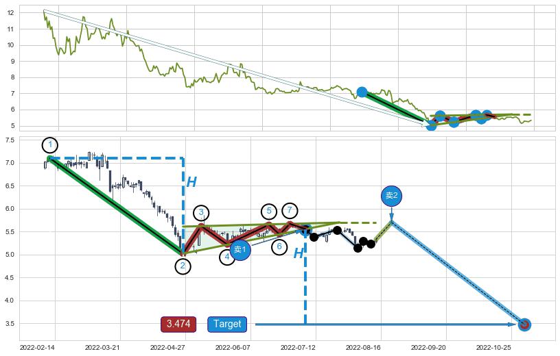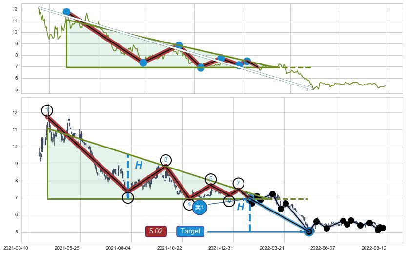 ➢ 【多方力量耗尽,空方打破攻守平衡点】下降三角形中继整理, 已在2022-01-25突破【支撑】颈线 6.95 →演变成下降通道