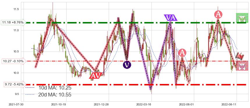 ➢ 【已确认突破】最后价格:10.28与最小【反转】第一目标价格→(2022-08-17: 9.93 )相较: 下跌空间【中等】