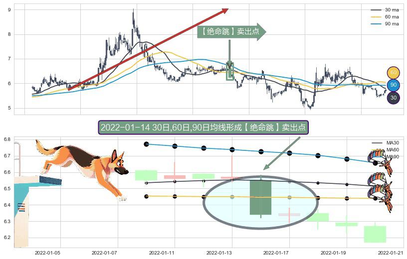 形态多维评估: ⚀ 2022-01-14日显现 30日-60日-90日均线 【绝命跳】卖出点 看空信号,后市看跌,卖出
